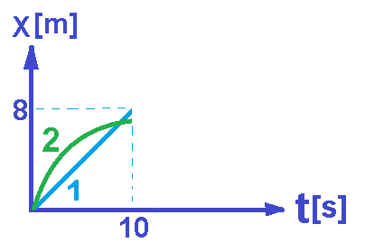 يتحرك الجسم 1 من نقطة بداية المحور من حالة السكون، بتسارع موجب ثابت لمدة 10 ثوانٍ. في نهاية حركة الجسم 1 ، سرعته 8 أمتار في الثانية.