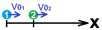 للتلخيص: يتحرك الجسمان في اتجاه المحور من موقعين ابتدائيين مختلفين. وحسب الموقعين الأوليين وسرعتي الجسمين، يمكن تحديد أن الجسم 1 يتحرك بسرعة آخذة بالازدياد في أعقاب الجسم 2 الذي يتحرك بسرعةآخذة بالنقصان.