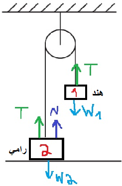 نعوّض التعبير لقوة الشد: «math xmlns=¨http://www.w3.org/1998/Math/MathML¨»«mstyle mathsize=¨20px¨»«mo mathvariant=¨bold¨ mathcolor=¨#0000FF¨»§#160;«/mo»«mi mathvariant=¨bold¨ mathcolor=¨#0000FF¨»T«/mi»«mo mathvariant=¨bold¨ mathcolor=¨#0000FF¨»=«/mo»«msub mathcolor=¨#0000FF¨»«mi mathvariant=¨bold¨ mathcolor=¨#0000FF¨»m«/mi»«mn mathvariant=¨bold¨»2«/mn»«/msub»«mo mathvariant=¨bold¨ mathcolor=¨#0000FF¨»§#183;«/mo»«mi mathvariant=¨bold¨ mathcolor=¨#0000FF¨»a«/mi»«mo mathvariant=¨bold¨ mathcolor=¨#0000FF¨»+«/mo»«msub mathcolor=¨#0000FF¨»«mi mathvariant=¨bold¨ mathcolor=¨#0000FF¨»m«/mi»«mn mathvariant=¨bold¨»2«/mn»«/msub»«mo mathvariant=¨bold¨ mathcolor=¨#0000FF¨»§#183;«/mo»«mi mathvariant=¨bold¨ mathcolor=¨#0000FF¨»g«/mi»«/mstyle»«/math» بالمعادلة: «math xmlns=¨http://www.w3.org/1998/Math/MathML¨»«mstyle mathsize=¨20px¨»«mi mathvariant=¨bold¨ mathcolor=¨#0000FF¨»F«/mi»«mo mathvariant=¨bold¨ mathcolor=¨#0000FF¨»+«/mo»«msub mathcolor=¨#0000FF¨»«mi mathvariant=¨bold¨ mathcolor=¨#0000FF¨»m«/mi»«mn mathvariant=¨bold¨»1«/mn»«/msub»«mo mathvariant=¨bold¨ mathcolor=¨#0000FF¨»§#183;«/mo»«mi mathvariant=¨bold¨ mathcolor=¨#0000FF¨»g«/mi»«mo mathvariant=¨bold¨ mathcolor=¨#0000FF¨»§#183;«/mo»«mi mathvariant=¨bold¨ mathcolor=¨#0000FF¨»sin«/mi»«mo mathvariant=¨bold¨ mathcolor=¨#0000FF¨»(«/mo»«mi mathvariant=¨bold¨ mathcolor=¨#0000FF¨»§#945;«/mi»«mo mathvariant=¨bold¨ mathcolor=¨#0000FF¨»)«/mo»«mo mathvariant=¨bold¨ mathcolor=¨#0000FF¨»-«/mo»«mi mathvariant=¨bold¨ mathcolor=¨#0000FF¨»T«/mi»«mo mathvariant=¨bold¨ mathcolor=¨#0000FF¨»=«/mo»«msub mathcolor=¨#0000FF¨»«mi mathvariant=¨bold¨ mathcolor=¨#0000FF¨»m«/mi»«mn mathvariant=¨bold¨»1«/mn»«/msub»«mo mathvariant=¨bold¨ mathcolor=¨#0000FF¨»§#183;«/mo»«msub mathcolor=¨#0000FF¨»«mi mathvariant=¨bold¨ mathcolor=¨#0000FF¨»a«/mi»«mn mathvariant=¨bold¨»1«/mn»«/msub»«/mstyle»«/math»