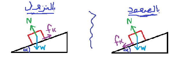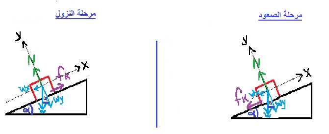 والجسم الموضوع على السطح المائل يتحرك من حالة السكون في اتجاه المنحدر، لأن القوة المحصّلة المؤثرة عليه تعمل في اتجاه المنحدر.