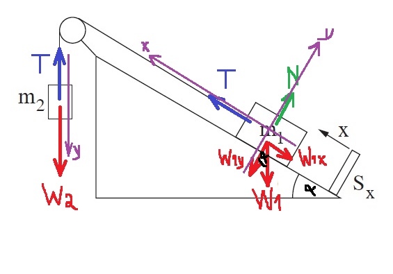 نكتب معادلة الحركة للجسم m1, في اتجاه عمودي للسطح المائل: «math xmlns=¨http://www.w3.org/1998/Math/MathML¨»«mstyle mathsize=¨20px¨»«msub mathcolor=¨#0000FF¨»«msub mathcolor=¨#0000FF¨»«mi mathvariant=¨bold¨ mathcolor=¨#0000FF¨»§#931;F«/mi»«mn mathvariant=¨bold¨»1«/mn»«/msub»«mi mathvariant=¨bold¨»y«/mi»«/msub»«mo mathvariant=¨bold¨ mathcolor=¨#0000FF¨»=«/mo»«mn mathvariant=¨bold¨ mathcolor=¨#0000FF¨»0«/mn»«mspace linebreak=¨newline¨»«/mspace»«mi mathvariant=¨bold¨ mathcolor=¨#0000FF¨»N«/mi»«mo mathvariant=¨bold¨ mathcolor=¨#0000FF¨»=«/mo»«msub mathcolor=¨#0000FF¨»«mi mathvariant=¨bold¨ mathcolor=¨#0000FF¨»W«/mi»«mrow»«mn mathvariant=¨bold¨»1«/mn»«mi mathvariant=¨bold-italic¨»Y«/mi»«/mrow»«/msub»«mspace linebreak=¨newline¨»«/mspace»«menclose mathcolor=¨#0000FF¨ notation=¨box¨»«mi mathvariant=¨bold¨»N«/mi»«mo mathvariant=¨bold¨»=«/mo»«mi mathvariant=¨bold¨»m«/mi»«mn mathvariant=¨bold¨»1«/mn»«mo mathvariant=¨bold¨»§#183;«/mo»«mi mathvariant=¨bold¨»g«/mi»«mo mathvariant=¨bold¨»§#183;«/mo»«mi mathvariant=¨bold¨»cos«/mi»«mo mathvariant=¨bold¨»(«/mo»«mi mathvariant=¨bold¨»§#945;«/mi»«mo mathvariant=¨bold¨»)«/mo»«/menclose»«/mstyle»«/math»