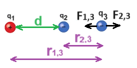 يتم وصف البعد «math xmlns=¨http://www.w3.org/1998/Math/MathML¨»«mstyle mathsize=¨24px¨»«msub»«mi mathvariant=¨bold¨»r«/mi»«mn mathvariant=¨bold¨»1«/mn»«/msub»«/mstyle»«/math» والقوى الكهربائية في الشكل التالي: