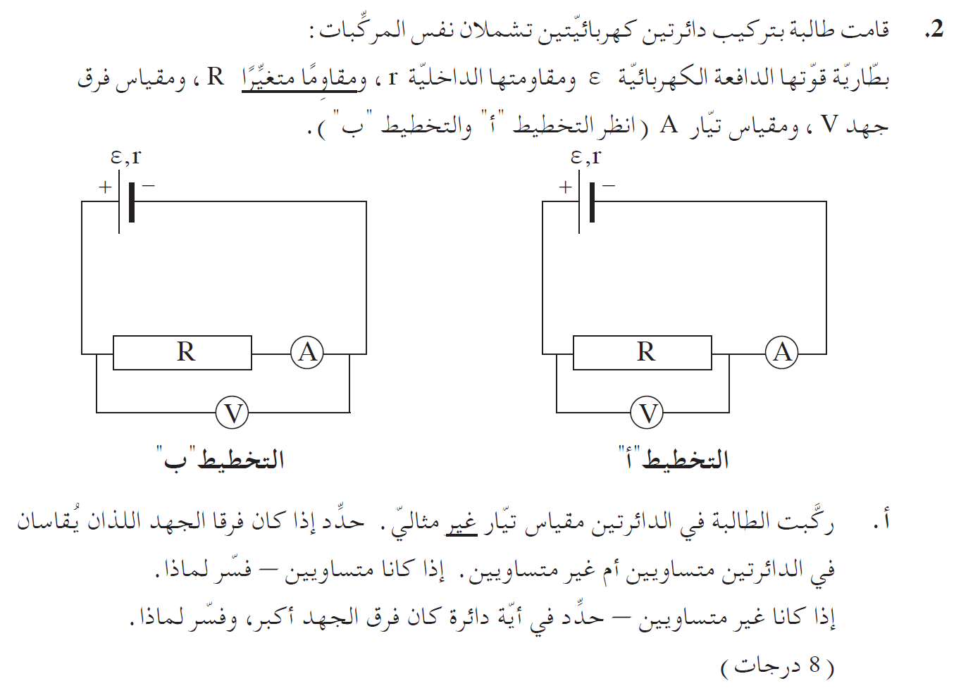 2. في الدائرة (أ)، فرق الجهد على R1 يساوي فرق الجهد على R3، لكن مقاومتهما مختلفة.