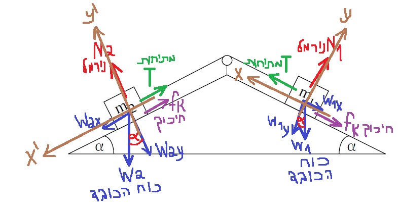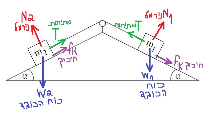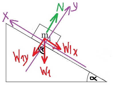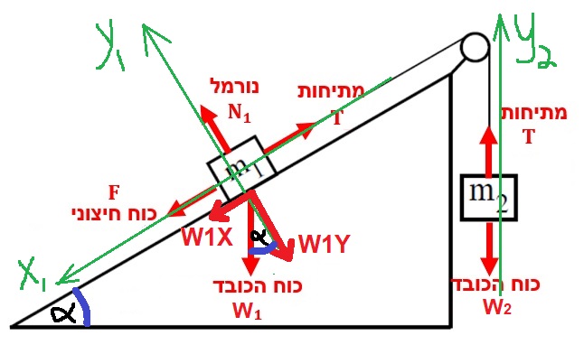 נכתוב את משוואת התנועה לגוף m1 , בכיוון ניצב למישור: «math xmlns=¨http://www.w3.org/1998/Math/MathML¨»«mstyle mathsize=¨20px¨»«msub mathcolor=¨#0000FF¨»«msub mathcolor=¨#0000FF¨»«mi mathvariant=¨bold¨ mathcolor=¨#0000FF¨»§#931;F«/mi»«mn mathvariant=¨bold¨»1«/mn»«/msub»«mi mathvariant=¨bold¨»y«/mi»«/msub»«mo mathvariant=¨bold¨ mathcolor=¨#0000FF¨»=«/mo»«mn mathvariant=¨bold¨ mathcolor=¨#0000FF¨»0«/mn»«mspace linebreak=¨newline¨»«/mspace»«mi mathvariant=¨bold¨ mathcolor=¨#0000FF¨»N«/mi»«mo mathvariant=¨bold¨ mathcolor=¨#0000FF¨»=«/mo»«msub mathcolor=¨#0000FF¨»«mi mathvariant=¨bold¨ mathcolor=¨#0000FF¨»W«/mi»«mrow»«mn mathvariant=¨bold¨»1«/mn»«mi mathvariant=¨bold-italic¨»Y«/mi»«/mrow»«/msub»«mspace linebreak=¨newline¨»«/mspace»«menclose mathcolor=¨#0000FF¨ notation=¨box¨»«mi mathvariant=¨bold¨»N«/mi»«mo mathvariant=¨bold¨»=«/mo»«mi mathvariant=¨bold¨»m«/mi»«mn mathvariant=¨bold¨»1«/mn»«mo mathvariant=¨bold¨»§#183;«/mo»«mi mathvariant=¨bold¨»g«/mi»«mo mathvariant=¨bold¨»§#183;«/mo»«mi mathvariant=¨bold¨»cos«/mi»«mo mathvariant=¨bold¨»(«/mo»«mi mathvariant=¨bold¨»§#945;«/mi»«mo mathvariant=¨bold¨»)«/mo»«/menclose»«/mstyle»«/math»