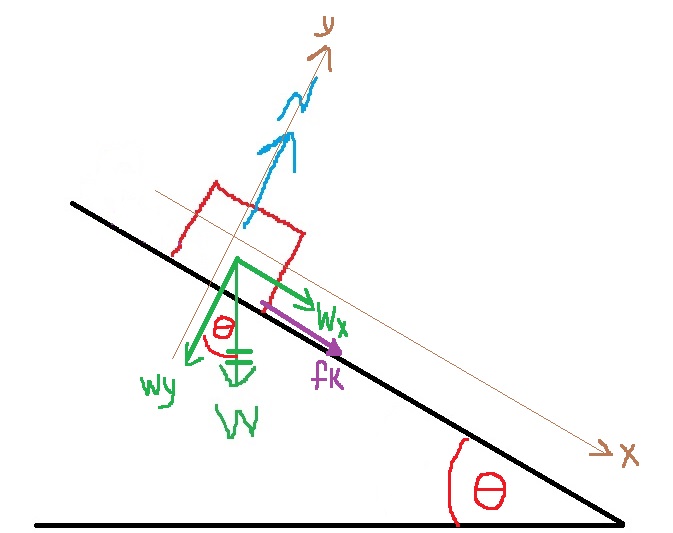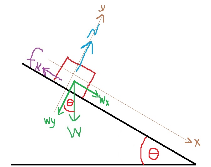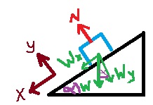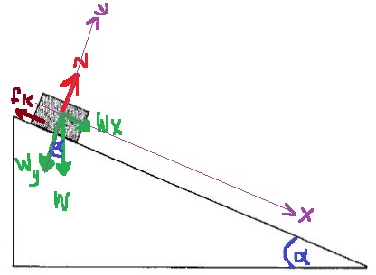 נוסיף לתרשים מערכת צירים , כיוון הציר בכיוון התאוצה . ונבצע הפרדה ישרת זווית לכוח הכובד הפועל על המסה המונחת על המישור המשופע.