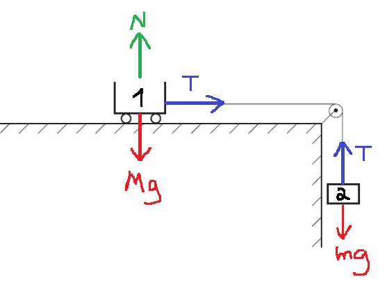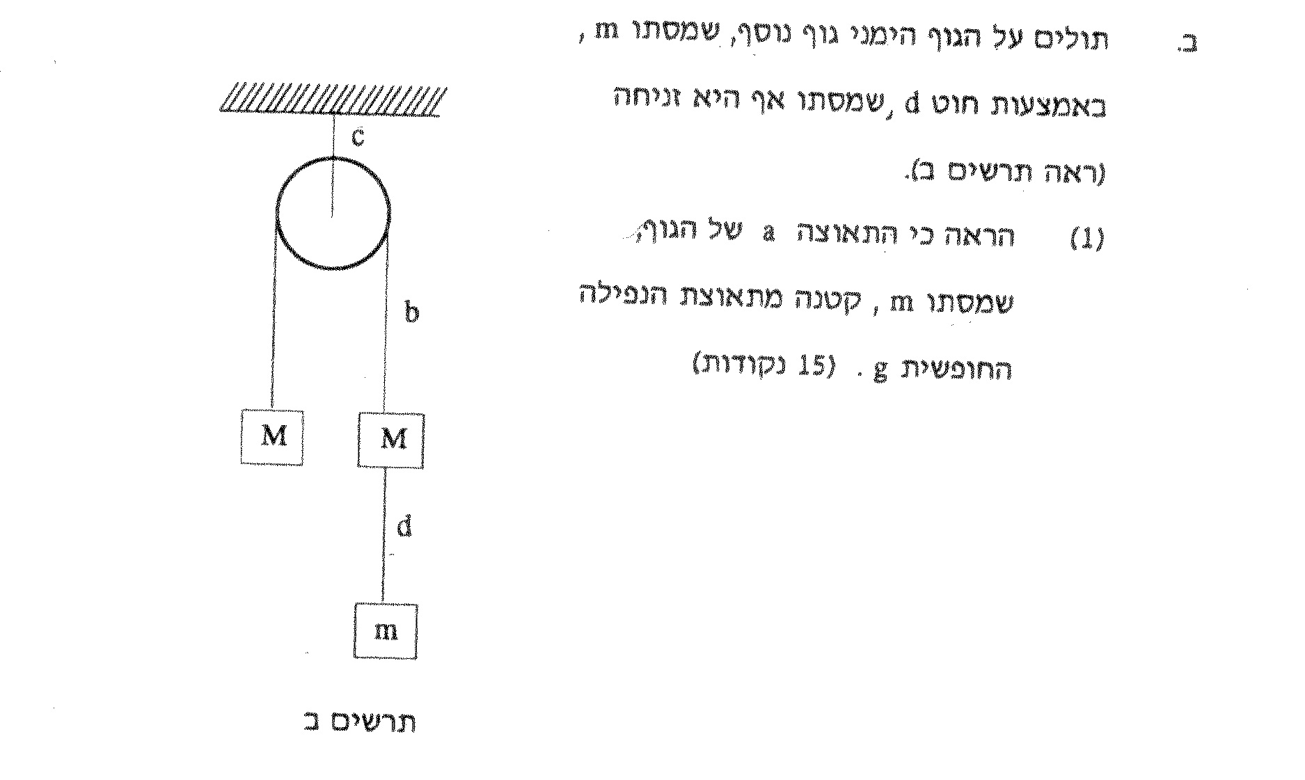 נתייחס לשני הגופים כאל גוף אחד שמסתו «math xmlns=¨http://www.w3.org/1998/Math/MathML¨»«mstyle mathsize=¨20px¨»«msub»«mi mathvariant=¨bold¨ mathcolor=¨#0000FF¨»m«/mi»«mn mathvariant=¨bold¨ mathcolor=¨#0000FF¨»1«/mn»«/msub»«mo mathvariant=¨bold¨ mathcolor=¨#0000FF¨»+«/mo»«mi mathvariant=¨bold¨ mathcolor=¨#0000FF¨»M«/mi»«/mstyle»«/math» המונעים במשקל הסל «math xmlns=¨http://www.w3.org/1998/Math/MathML¨»«mstyle mathsize=¨22px¨»«msub»«mi mathvariant=¨bold¨ mathcolor=¨#0000FF¨»m«/mi»«mn mathvariant=¨bold¨ mathcolor=¨#0000FF¨»1«/mn»«/msub»«mo mathvariant=¨bold¨ mathcolor=¨#0000FF¨»§#183;«/mo»«mi mathvariant=¨bold¨ mathcolor=¨#0000FF¨»g«/mi»«/mstyle»«/math».
