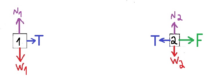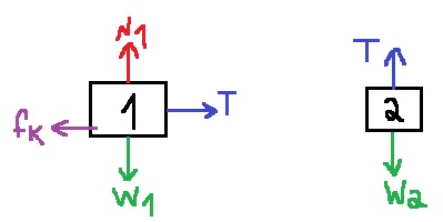 נבטא את תאוצת הגופים ממשוואות התנועה, נציב את המתיחות ממשואת התנועה של גוף 2 במשוואת התנועה האופקית של גוף 1.