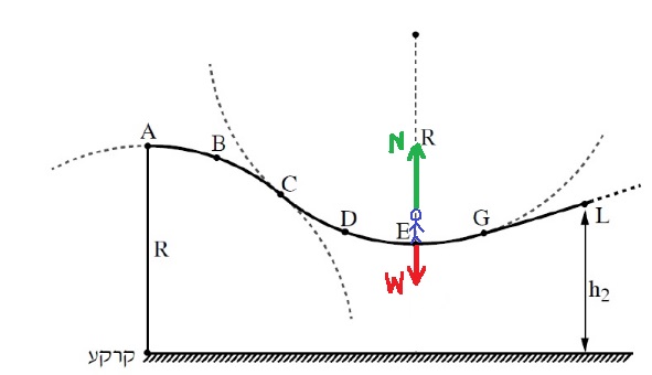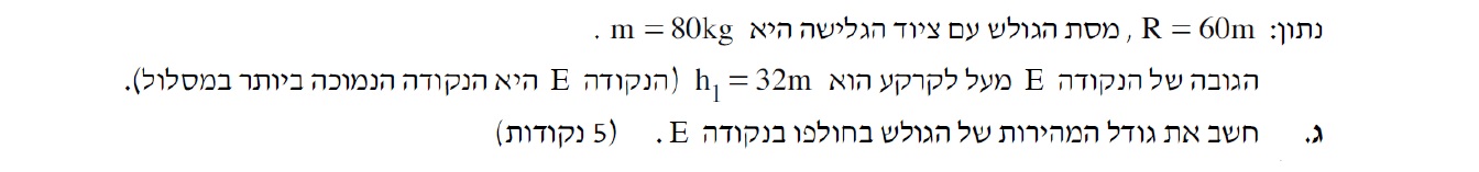 גובה הנקודה E שווה לפעמיים רדיוס הסיבוב . גובה הנקודה A נתון . נציב את ערכי הגבהים ונמצא את מהירות הגוף בנקודה E.