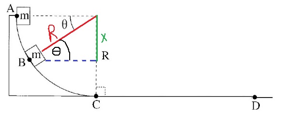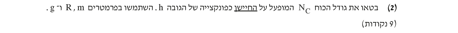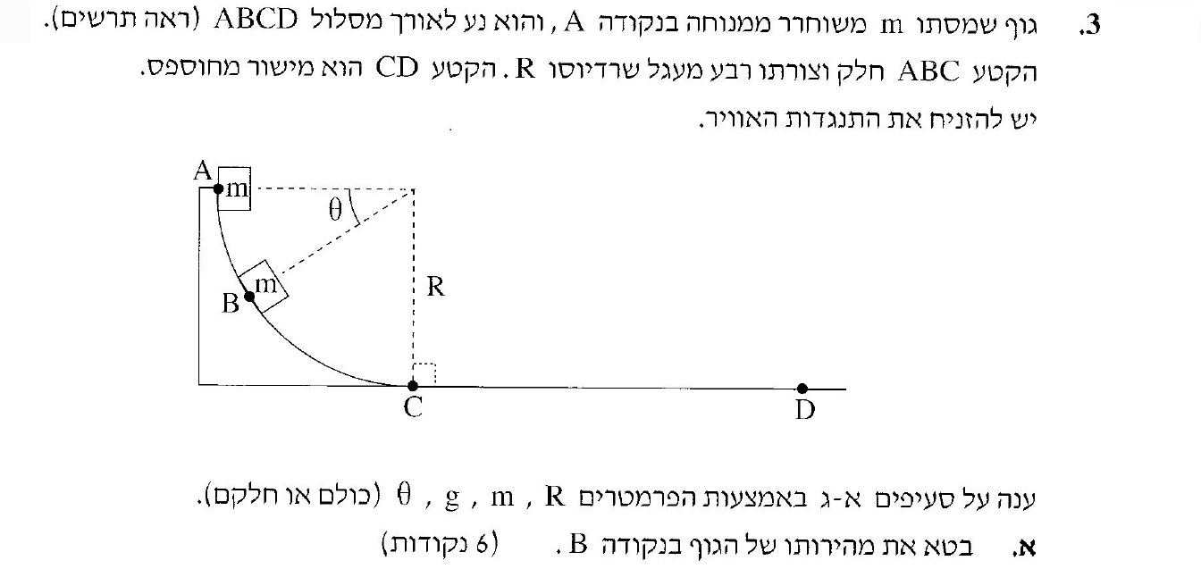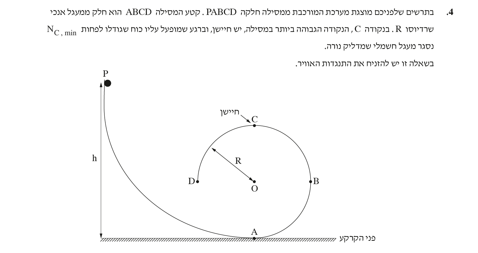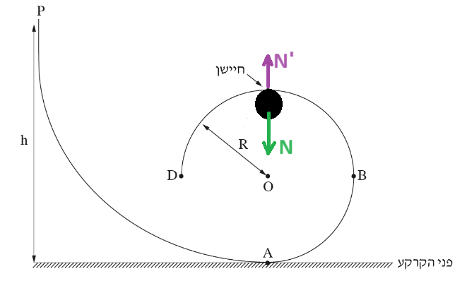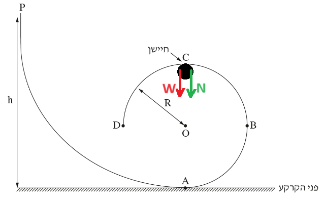 בשאלה נדרש לבטא את כוח הנורמל בנקודה C בתלות בנתונים: m ,R ,g ו- h . נבטא את המהירות בנקודה C בעזרת שיקולי אנרגיה.