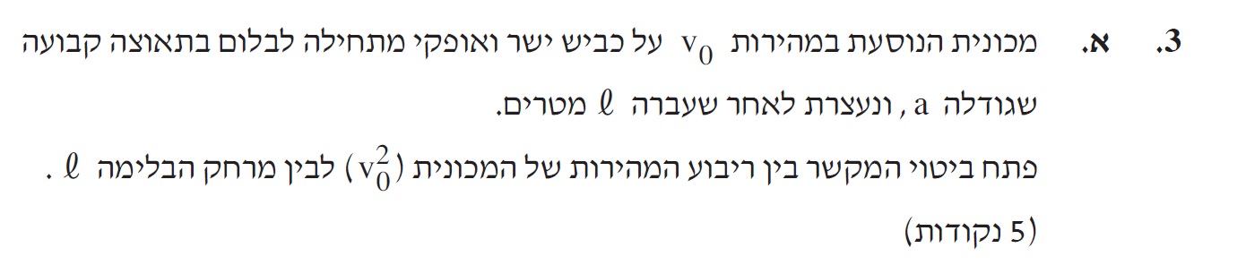 נציב את נתוני התנועה ונבטא את ריבוע המהירות ההתחלתית בתלות במרחק הבלימה.
