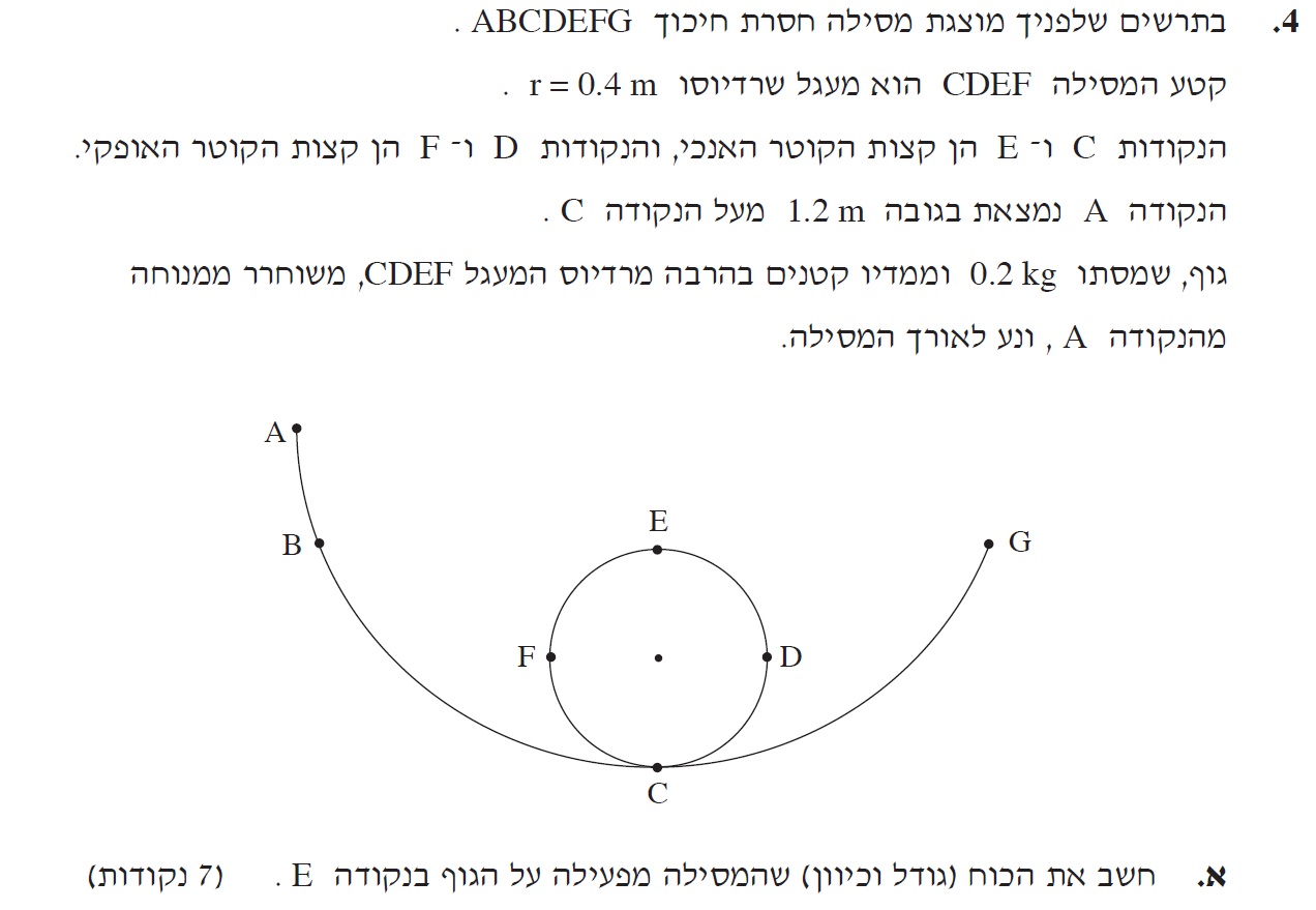 נשווה בין האנרגיה בנקודה A לאנרגיה בנקודה E. ונמצא ממשוואת שימור האנרגיה את מהירות הגוף בנקודה E: