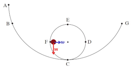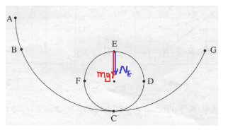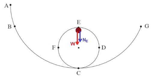 ערך הנורמל קטן מאפס בנקודה E, לכן הגוף לא מגיע לנקודה E.
