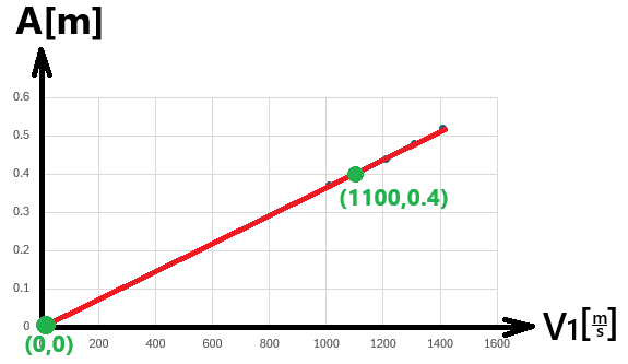 من الدالة يمكن تحديد تعبير الميل في الرسم البياني الذي يصف السعة بدلالة سرعة الرصاصة، وتعبير ميل الرسم البياني هو:
