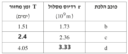 נתונה טבלה המכיל את רדיוס מסלול כוכבי הלכת וזמן ההקפה.