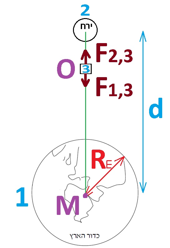 נסמן את כדור הארץ כגוף 1, ואת הירח כגוף 2. נמקם גוף בנקודה "O" , נסמן גוף זה כגוף מספר 3.