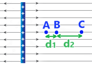 נבטא את הפרש הפוטנצילים בין הנקודות A ל B , כאשר המרחק בין הכדור הטעון לנקודה B הוא «math xmlns=¨http://www.w3.org/1998/Math/MathML¨»«mstyle mathsize=¨24px¨»«msub»«mi mathvariant=¨bold¨ mathcolor=¨#0000FF¨»d«/mi»«mn mathvariant=¨bold¨ mathcolor=¨#0000FF¨»2«/mn»«/msub»«/mstyle»«/math»:
