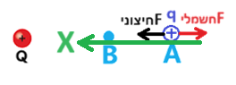 המטען «math xmlns=¨http://www.w3.org/1998/Math/MathML¨»«mstyle mathsize=¨20px¨»«msub»«mi mathvariant=¨bold¨ mathcolor=¨#0000FF¨»Q«/mi»«mn mathvariant=¨bold¨ mathcolor=¨#0000FF¨»2«/mn»«/msub»«/mstyle»«/math» נזרק מהנקודה A ימינה, המטען «math xmlns=¨http://www.w3.org/1998/Math/MathML¨»«mstyle mathsize=¨20px¨»«msub»«mi mathvariant=¨bold¨ mathcolor=¨#0000FF¨»Q«/mi»«mn mathvariant=¨bold¨ mathcolor=¨#0000FF¨»1«/mn»«/msub»«/mstyle»«/math» מקובע במקומו.