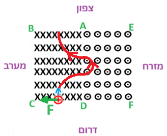 מכלל יד שמאל כיוון הזרם (האמה) החוצה מהדף כיוון השדה המגנטי (האצבע) ימינה, בהתאם כיוון הכוח המגנטי(האגודל) הוא כלפי מעלה, כפי שניתן לראות בתרשים הבא: