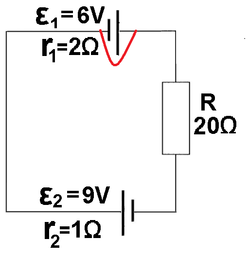 ב- מכיוון שמקור 2 יוצר זרם נגד כיוון השעון והכא"מ שלו גדול יותר. במעגל יזרום זרם נגד כיוון השעון.