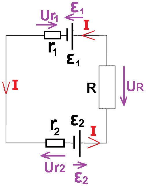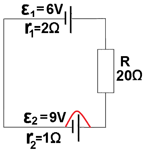 מקורות המתח יוצרים זרמים בכיוונים מנוגדים, הזרם הנוצר ע"י מקור 2 גדול מהזרם הנוצר ע"י מקור 1.