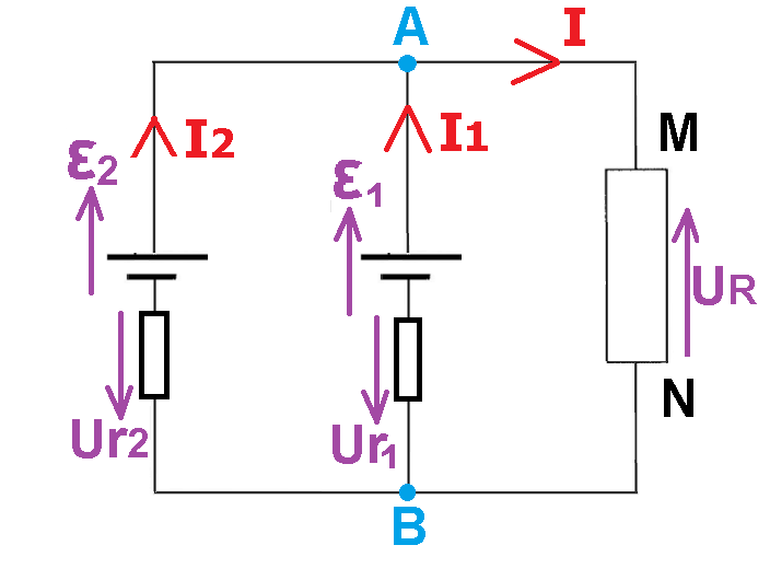מכיוון ששני הזרמים I1 ו- I2 נכנסים לצומת A , הזרם I יוצא מהצומת והוא נע בנגד R מנקודה M לנקודה N.