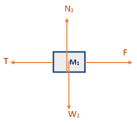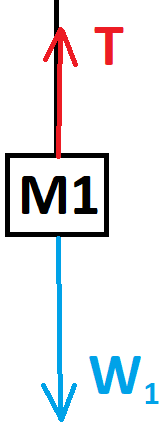 על הגוף הימני M1 פועלים ארבעה כוחות: כוח חיצוני F ימינה, כוח המתיחות T, כוח הכובד W1 וכוח הנורמל N1.