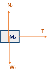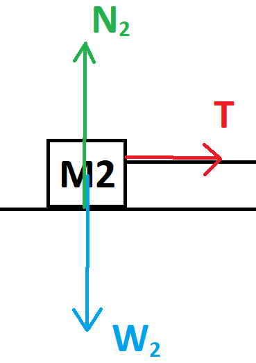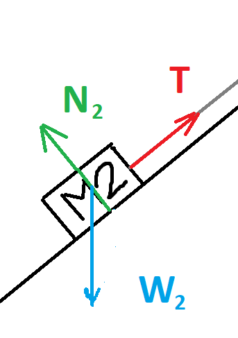 על הגוף השמאלי M2 פועלים שלושה כוחות: כוח המתיחות T, כוח הכובד W2 וכוח הנורמל N2.