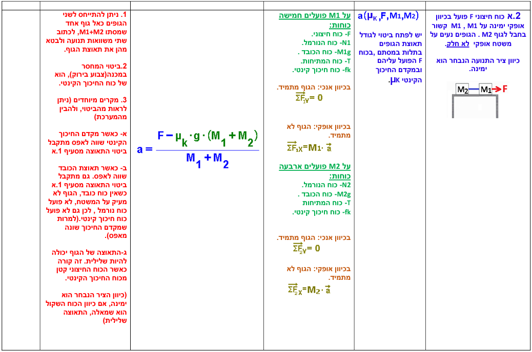 על מערכת שני הגופים פועל כוח שקול שגודלו F כלפי ימין, שני הגופים לא מתמידים בתנועתם, נכתוב משוואת התנועה על מערכת שני הגופים יחד בכיוון אופקי: