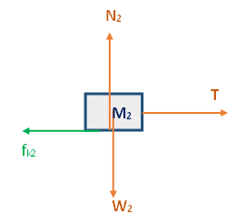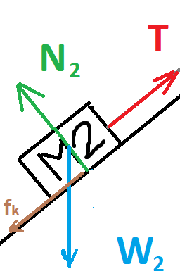 על הגוף השמאלי M2 פועלים ארבעה כוחות: כוח המתיחות T, כוח החיכוך fk2, כוח הכובד W2 וכוח הנורמל N2.