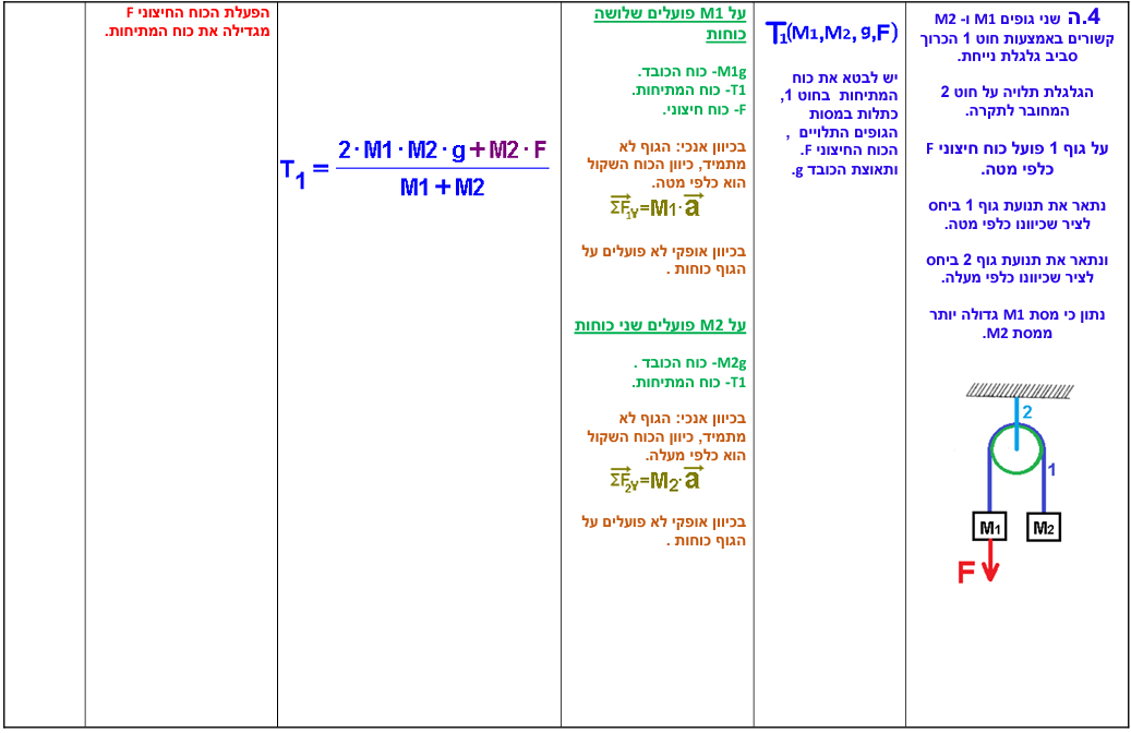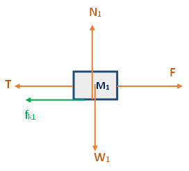על הגוף הימני M1 פועלים חמישה כוחות: כוח חיצוני F, כוח חיכוך fk1, כוח המתיחות T, כוח הכובד W1 וכוח הנורמל N1.