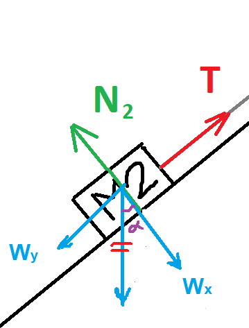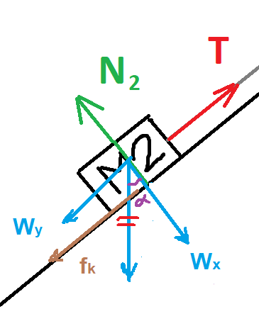 על גוף 2 פועלים ארבעה כוחות: כוח הכובד W2, כוח החיכוך fk2, כוח המתיחות T וכוח נורמל N2.