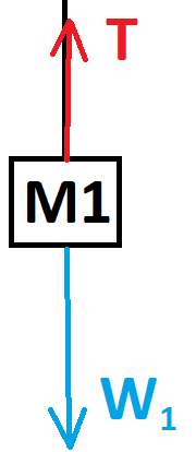 על כל אחד מהגופים פועלים שני כוחות: כוח הכובד W וכוח המתיחות T1.