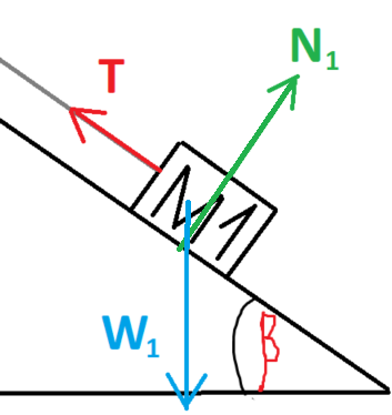 על גוף 1 פועלים ארבעה כוחות: כוח הכובד W1, כוח החיכוך fk1, כוח המתיחות T וכוח נורמל N1.