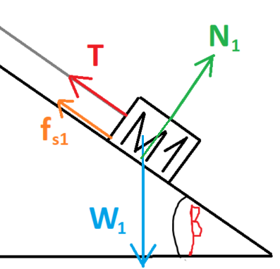 על גוף 1 פועלים ארבעה כוחות: כוח הכובד W, כוח החיכוך fs, כוח המתיחות T וכוח נורמל N.