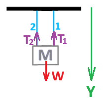 يؤثِّر على الجسم المعلَّق قوّتان: قوّة الجاذبية باتجاه الأسفل، وقوّة الشدّ باتجاه الأعلى. سنرسم مخطّط قوى للقوى المؤثِّرة على الجسم، ونصف هذه القوى بالنسبة لمحور Y العمودي إلى أعلى.