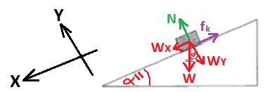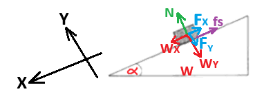 في هذه الحالة، تؤثِّر قوتان في اتجاه محور X، «math xmlns=¨http://www.w3.org/1998/Math/MathML¨»«msub»«mi mathvariant=¨bold¨ mathcolor=¨#0000FF¨»W«/mi»«mi mathvariant=¨bold¨ mathcolor=¨#0000FF¨»X«/mi»«/msub»«/math» و- «math xmlns=¨http://www.w3.org/1998/Math/MathML¨»«mstyle mathsize=¨22px¨»«msub»«mi mathvariant=¨bold¨ mathcolor=¨#0000FF¨»f«/mi»«mi mathvariant=¨bold¨ mathcolor=¨#0000FF¨»k«/mi»«/msub»«/mstyle»«/math» , بما أنّ القوتين المؤثرتين تعملان في نفس الاتجاه (باتجاه أسفل المستوى المائل)، فلا يمكن أن يكون محصّلة القوى صفرًا.