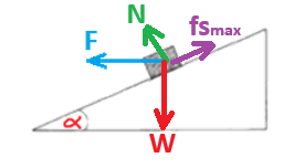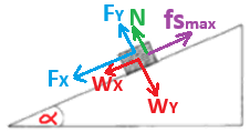 تؤثر ثلاث قوى على الجسم: قوة الجاذبية، وقوة الضغط العمودية، وقوة الاحتكاك الساكن المؤثرة على طول السطح.