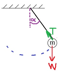 נערוך תרשים כוחות על המשקולת כאשר היא נמצאת בנקודת הקיצון (זווית נטיית החוט מקסימאלית).
