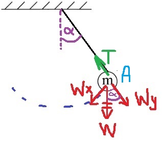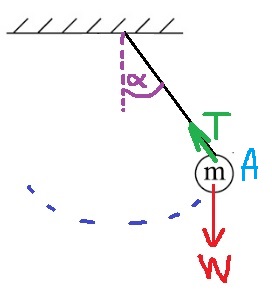 נערוך תרשים כוחות על המשקולת כאשר היא נמצאת בנקודת הקיצון בנקודה A (זווית נטיית החוט מקסימאלית).