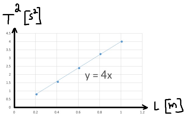 נתאר בגרף את ריבוע זמן המחזור בתלות באורך המטוטלת: