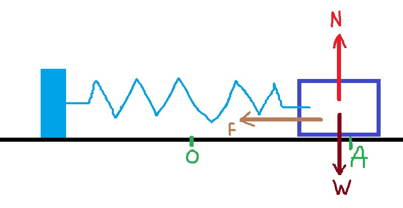 النقطة O هي نقطة الاتزان، عندما يمر الجسم عبر النقطة O فإن القوة المحصلة المؤثرة عليه تساوي صفرًا.