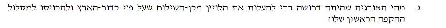 לכן, האנרגיה הדרושה להעלאת הלוויין היא «math xmlns=¨http://www.w3.org/1998/Math/MathML¨»«mn mathvariant=¨bold¨ mathcolor=¨#0000FF¨»5«/mn»«mo mathvariant=¨bold¨ mathcolor=¨#0000FF¨».«/mo»«mn mathvariant=¨bold¨ mathcolor=¨#0000FF¨»43«/mn»«mo mathvariant=¨bold¨ mathcolor=¨#0000FF¨»§#183;«/mo»«msup»«mn mathvariant=¨bold¨ mathcolor=¨#0000FF¨»10«/mn»«mn mathvariant=¨bold¨ mathcolor=¨#0000FF¨»10«/mn»«/msup»«/math» ג'אול.