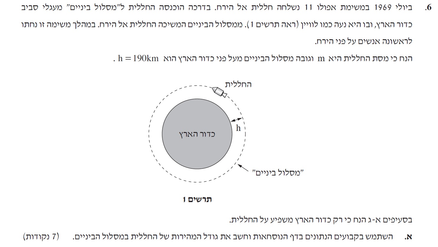 מביטוי מהירות החללית בסעיף א' : «math xmlns=¨http://www.w3.org/1998/Math/MathML¨»«mi mathvariant=¨bold¨ mathcolor=¨#0000FF¨»V«/mi»«mo mathvariant=¨bold¨ mathcolor=¨#0000FF¨»=«/mo»«msqrt mathcolor=¨#0000FF¨»«mfrac»«mrow»«mi mathvariant=¨bold¨»G«/mi»«mo mathvariant=¨bold¨»§#183;«/mo»«msub»«mi mathvariant=¨bold¨»M«/mi»«mi mathvariant=¨bold¨»E«/mi»«/msub»«/mrow»«mrow»«msub»«mi mathvariant=¨bold¨»R«/mi»«mi mathvariant=¨bold¨»E«/mi»«/msub»«mo mathvariant=¨bold¨»+«/mo»«mi mathvariant=¨bold¨»h«/mi»«/mrow»«/mfrac»«/msqrt»«/math» המהירות לא תלויה במסת החללית.