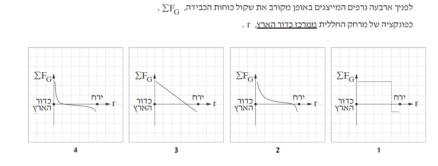 מסת כדור הארץ גדולה ממסת הירח, מכאן ששקול הכוחות שווה לאפס בסמוך לירח , לכן הגרף המתאים הוא גרף 2.