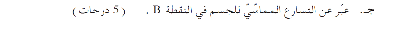 تعبير السرعة بالنقطة B هو: «math xmlns=¨http://www.w3.org/1998/Math/MathML¨»«msub»«mi mathvariant=¨bold¨ mathcolor=¨#0000FF¨»V«/mi»«mi mathvariant=¨bold¨ mathcolor=¨#0000FF¨»B«/mi»«/msub»«mo mathvariant=¨bold¨ mathcolor=¨#0000FF¨»=«/mo»«msqrt mathcolor=¨#0000FF¨»«mn mathvariant=¨bold¨»2«/mn»«mo mathvariant=¨bold¨»§#183;«/mo»«mi mathvariant=¨bold¨»g«/mi»«mo mathvariant=¨bold¨»§#183;«/mo»«mi mathvariant=¨bold¨»R«/mi»«mo mathvariant=¨bold¨»§#183;«/mo»«mi mathvariant=¨bold¨»sin«/mi»«mo mathvariant=¨bold¨»(«/mo»«mi mathvariant=¨bold¨»§#952;«/mi»«mo mathvariant=¨bold¨»)«/mo»«mo mathvariant=¨bold¨»)«/mo»«/msqrt»«/math»