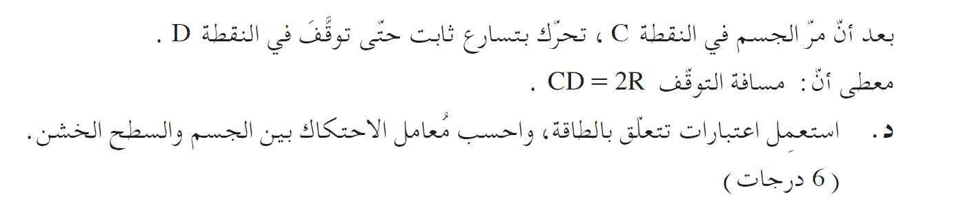 السرعة في النقطة D تساوي صفرًا ، نجد السرعة عند النقطة C من اعتبارات الطاقة: