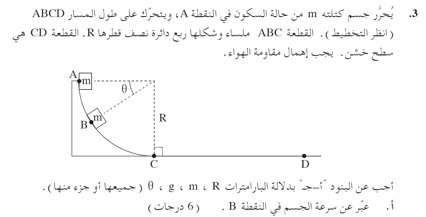 التعبير للسرعة في النقطة B هو «math xmlns=¨http://www.w3.org/1998/Math/MathML¨»«msub»«mi mathvariant=¨bold¨»V«/mi»«mi mathvariant=¨bold¨»B«/mi»«/msub»«mo mathvariant=¨bold¨»=«/mo»«msqrt»«mn mathvariant=¨bold¨»2«/mn»«mo mathvariant=¨bold¨»§#183;«/mo»«mi mathvariant=¨bold¨»g«/mi»«mo mathvariant=¨bold¨»§#183;«/mo»«mi mathvariant=¨bold¨»R«/mi»«mo mathvariant=¨bold¨»§#183;«/mo»«mi mathvariant=¨bold¨»sin«/mi»«mo mathvariant=¨bold¨»(«/mo»«mi mathvariant=¨bold¨»§#952;«/mi»«mo mathvariant=¨bold¨»)«/mo»«mo mathvariant=¨bold¨»)«/mo»«/msqrt»«/math» .