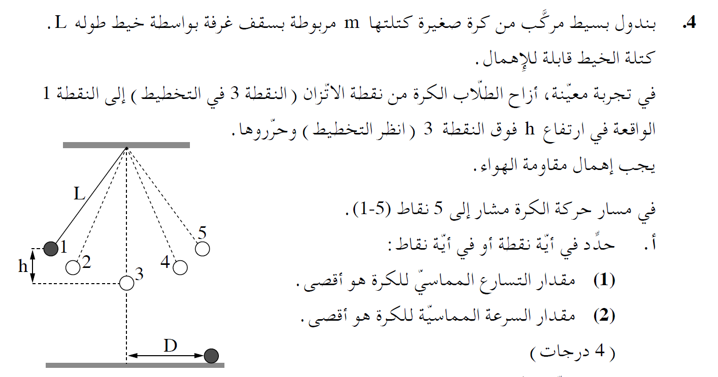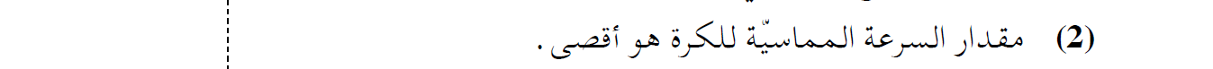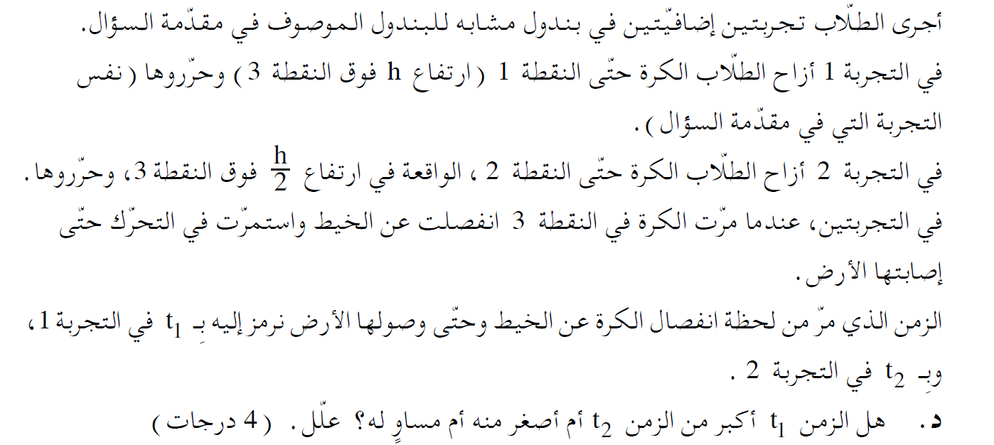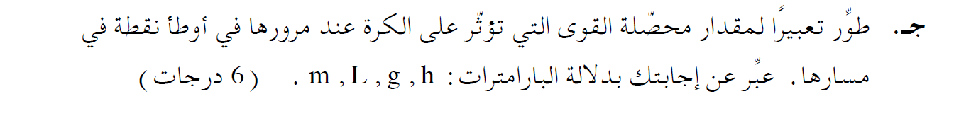 وجدنا تعبيرًا لهذه السرعة في القسم "جـ" : «math xmlns=¨http://www.w3.org/1998/Math/MathML¨»«msub»«mi mathvariant=¨bold¨ mathcolor=¨#0000FF¨»V«/mi»«mn mathvariant=¨bold¨ mathcolor=¨#0000FF¨»3«/mn»«/msub»«mo mathvariant=¨bold¨ mathcolor=¨#0000FF¨»=«/mo»«msqrt mathcolor=¨#0000FF¨»«mn mathvariant=¨bold¨»2«/mn»«mo mathvariant=¨bold¨»§#183;«/mo»«mi mathvariant=¨bold¨»g«/mi»«mo mathvariant=¨bold¨»§#183;«/mo»«mi mathvariant=¨bold¨»h«/mi»«/msqrt»«/math» , h هو الارتفاع فوق النقطة 3 التي تم تحرير الكرة منها.