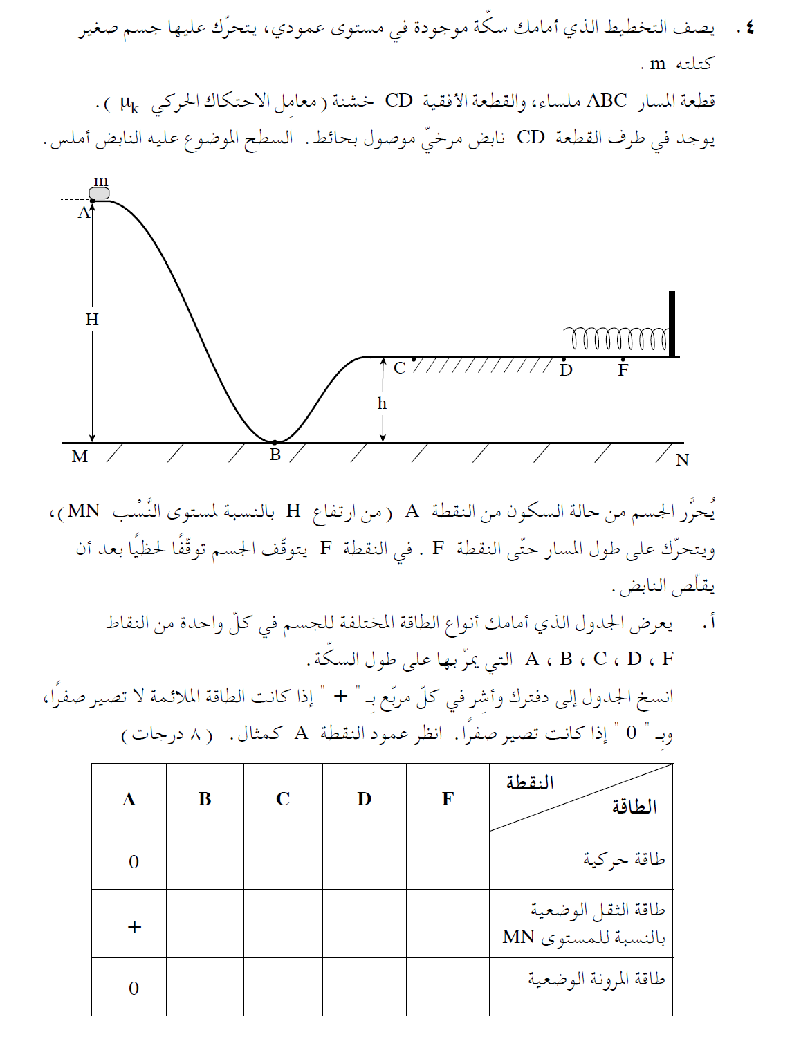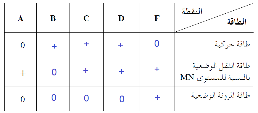في النقطة F ، يتوقف الجسم، وبالتالي فإن الطاقة الحركية في هذه النقطة هي صفر.