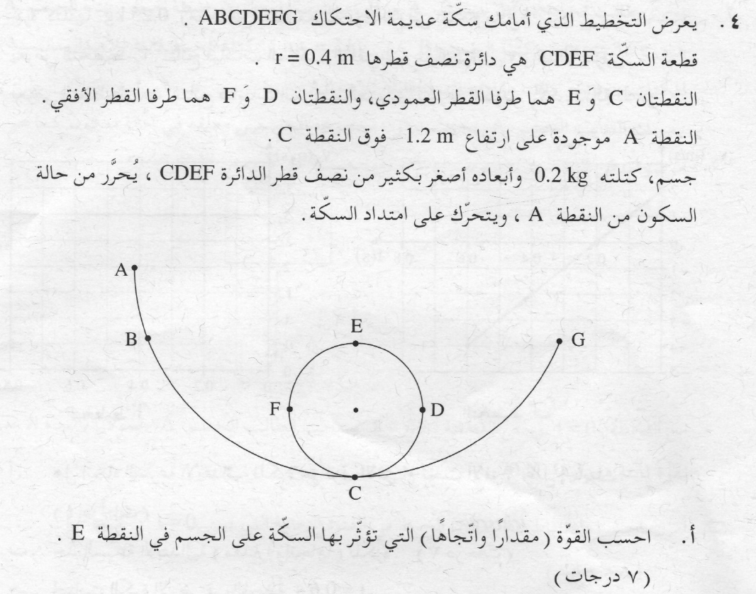ومن ثم فإن مقدار القوة العمودية هو 2 نيوتن. اتجاه القوة العمودية حسب موقع الجسم على السكة يكون لأسفل.